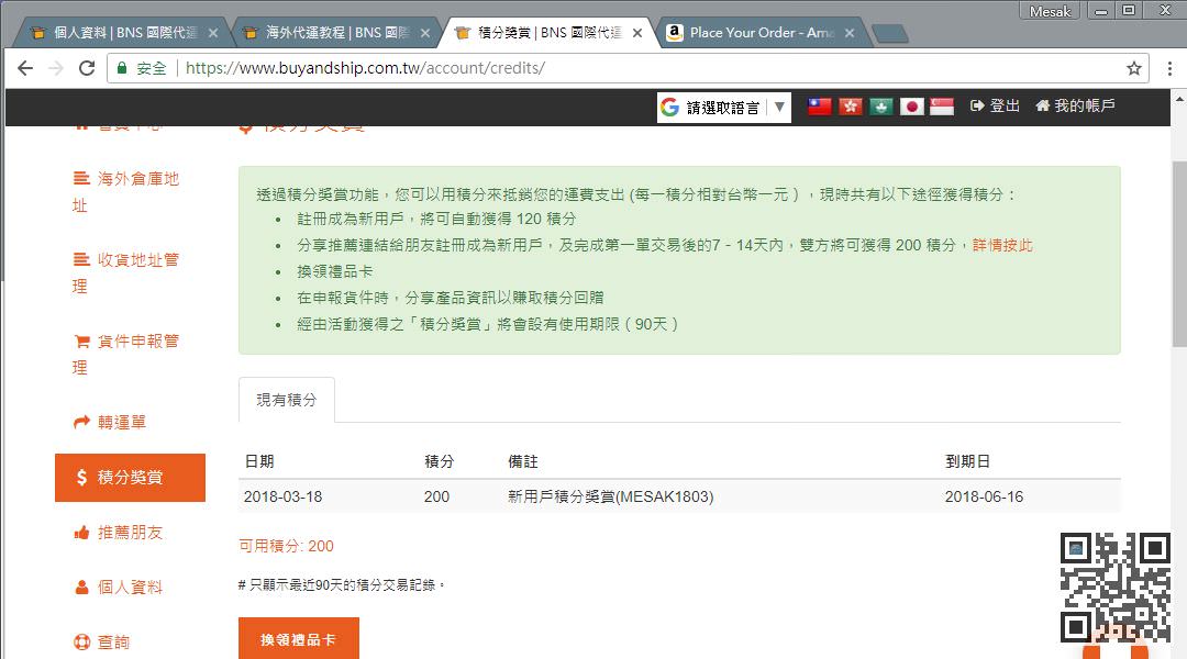 註冊完畢之後就可以看到自己的積分,新會員註冊贈送 120 積分,填寫推薦碼送 80積分,這下有 200 積分可以扣抵,一個積分等於一元,這樣等於可以扣抵兩百元。
