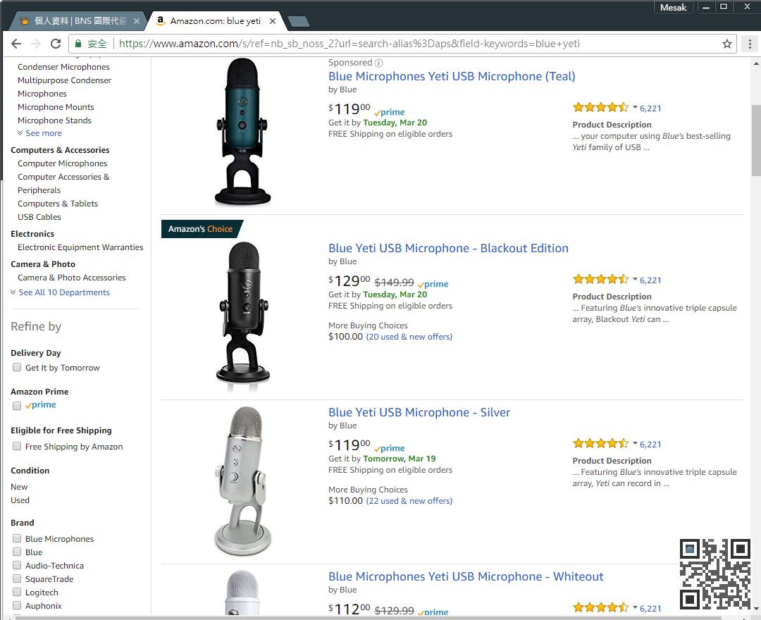 接著到 Amazon.com 網站,搜尋 “Blue Yeti” ,可以看到琳瑯滿目的商品推薦。