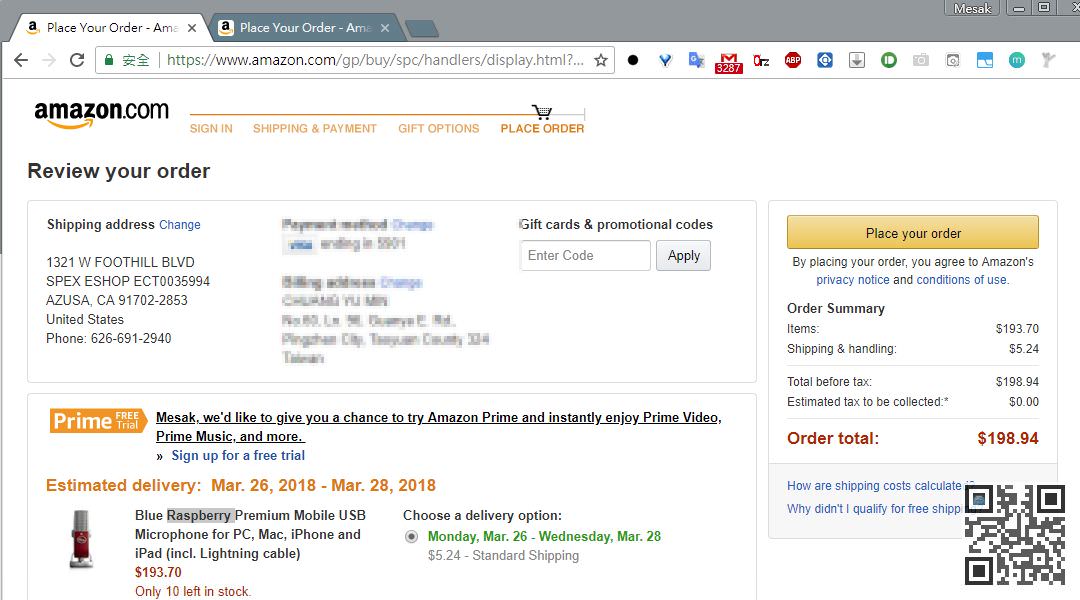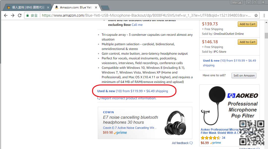 目前許多直播開台都會在室外或是戶外,如果覺得 Yeti 太笨重沒辦法接手機或是不好攜帶,想要在外面也可以得到良好的收音效果,可以參考這款 Raspberry (覆盆子紅),這款麥克風在台灣網站的售價是 NT8000 元台幣,依照上方搜尋 Yeti 的步驟一樣找到 $ 193.7 這個價位,由 “FOUR COLOR PRINT” 這個賣家所提供的,運費需要 $ 5.24 美金所以 合計是 $ 198.94