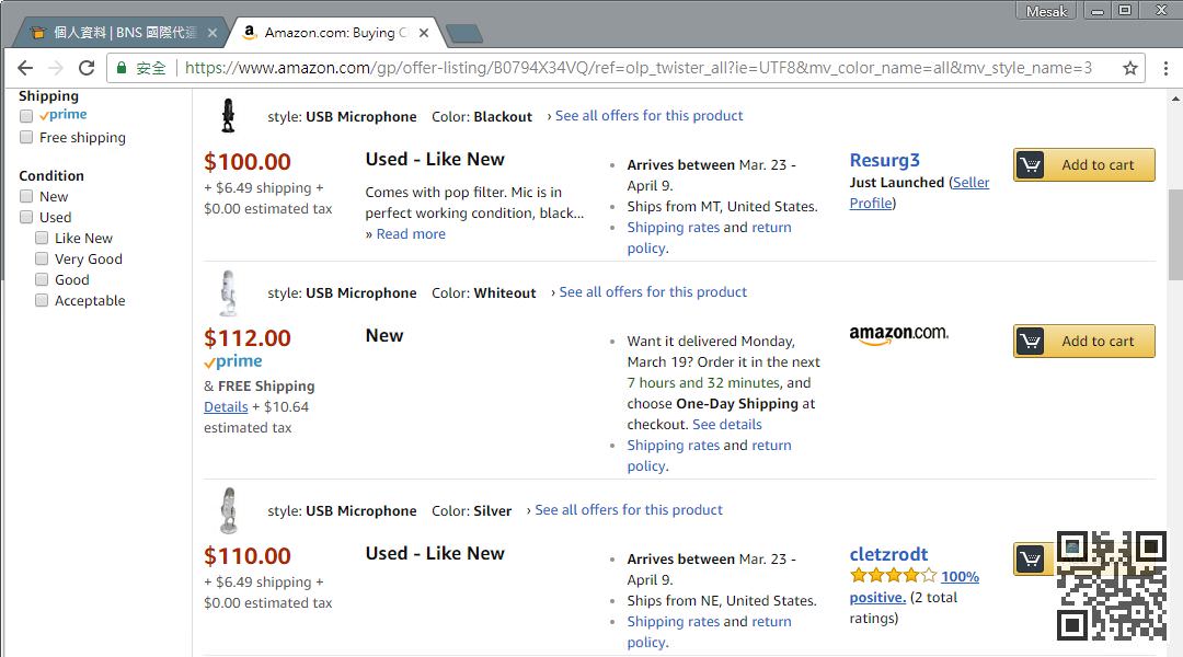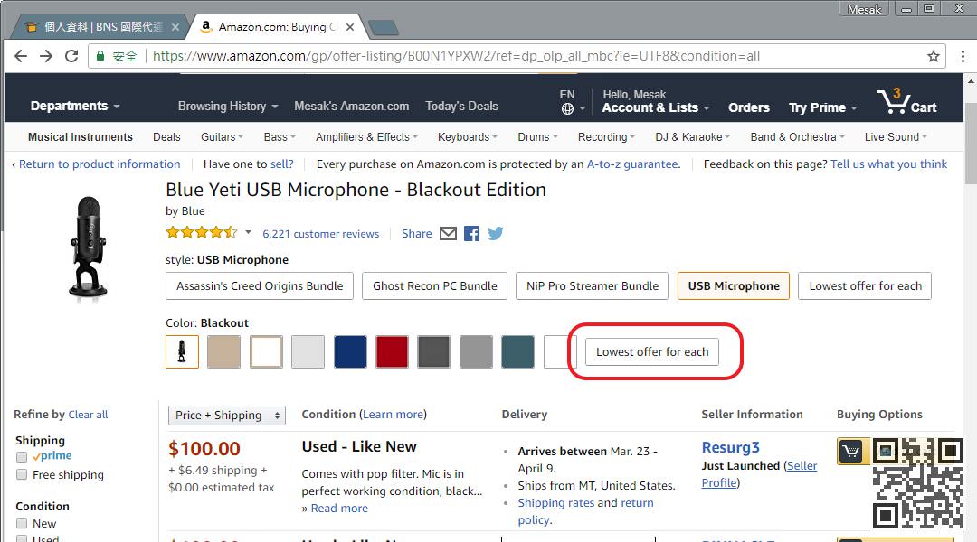 別擔心這邊 Mesak 推薦一下其他的入手管道。Yeti 在國外的購物網站價錢都在 $110~$125 美金左右,以目前的匯率來算,一隻麥克風的價位在 NT3300~ NT3700 左右,如果遇上特殊節日的價格,那又更便宜了。以美國 Amazon 的價格來看,目前最便宜的單價是 $ 119 左右,這個價位其實相當值得入手,只要找到 Amazon 的各個供應商提供的單價來購買,但是當我們找到了便宜的供應商價位,但是廠商不送台灣怎麽辦呢?