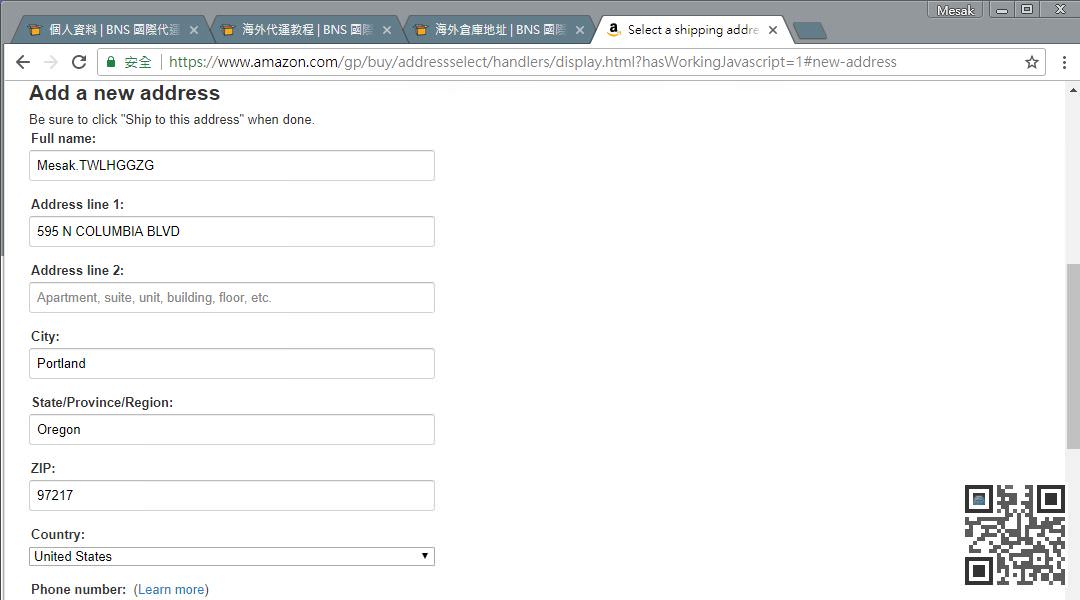 接著在 Amazon 的運送地址照 Buyandship 提供的地址填入,要注意的就是 Name 裡面的代碼一定要填入。