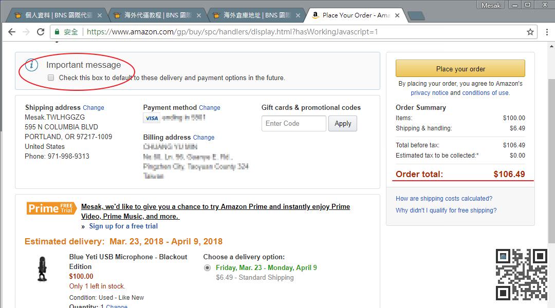 接著就直接結帳,這邊可以看到加上運費,最便宜的只需要 $ 106.49 美金,如果常要常買的話可以勾選紀錄預設地址為 Buyandship 集運倉地址。