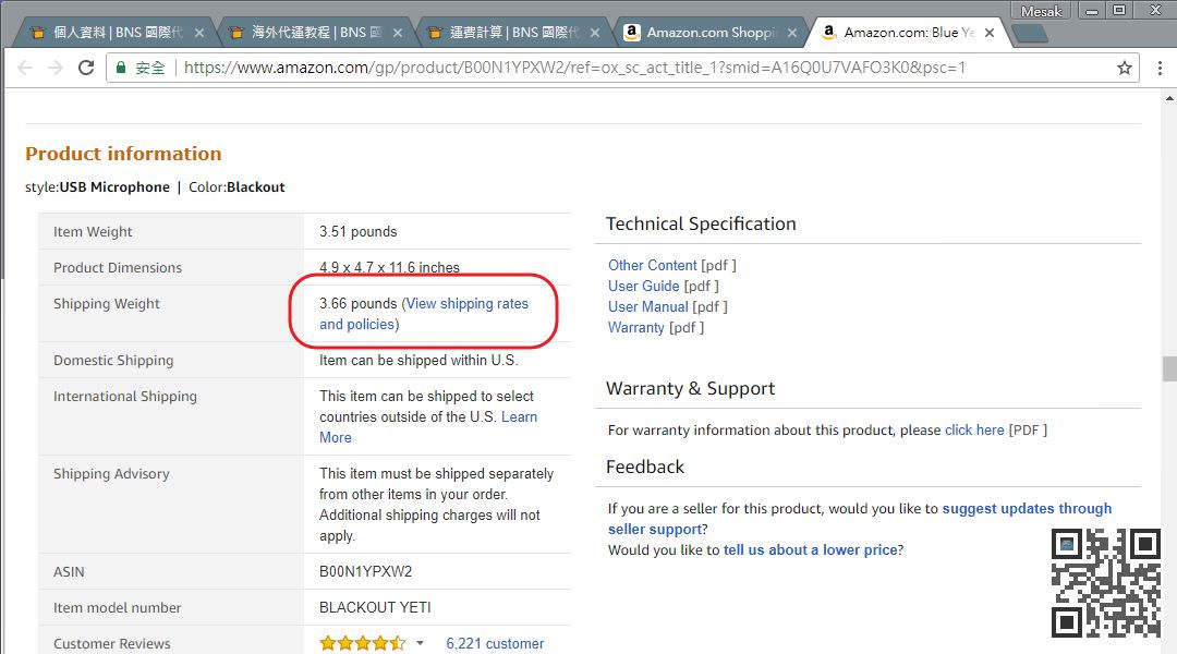 如果要想要推算一下運費的話, Amazon 最下方的商品資訊大部分都會有重量,國外大多都用磅來計算,一磅大約是 453.592 公克,這邊可以看到 Yeti 的運送重量是 3.66 磅。