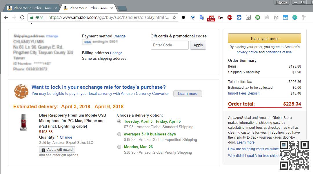 Amazon.com 賣家提供的單價是 $198.88,運費是 $7.98,還要加上 州稅以及預收關稅,所以合計是 $225.34,以匯率來計算是 $225.34 * 29.5 = NT6650 左右 (我習慣去尾數進位來算 )