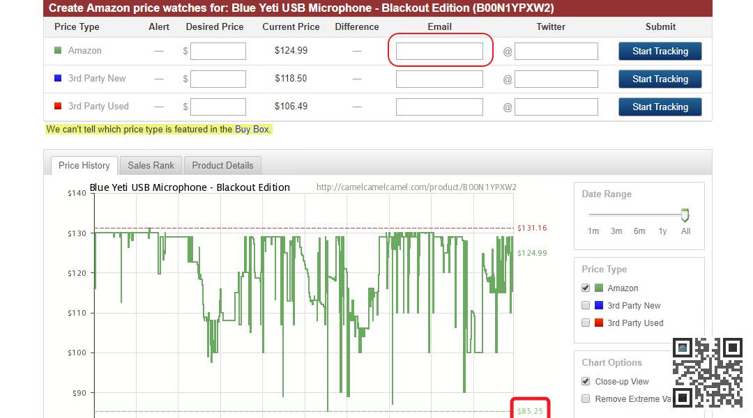 但是我們不是每天都在盯著價錢的起落,所以只需要在紅框內的 email 填入自己的電子信箱,左邊設定 desired price 低於這個價錢,按下 Start Tracking 就可以在低價的時候發 EMAIL通知了,只需要記得收信回來看就好了,是不是相當的方便呢。