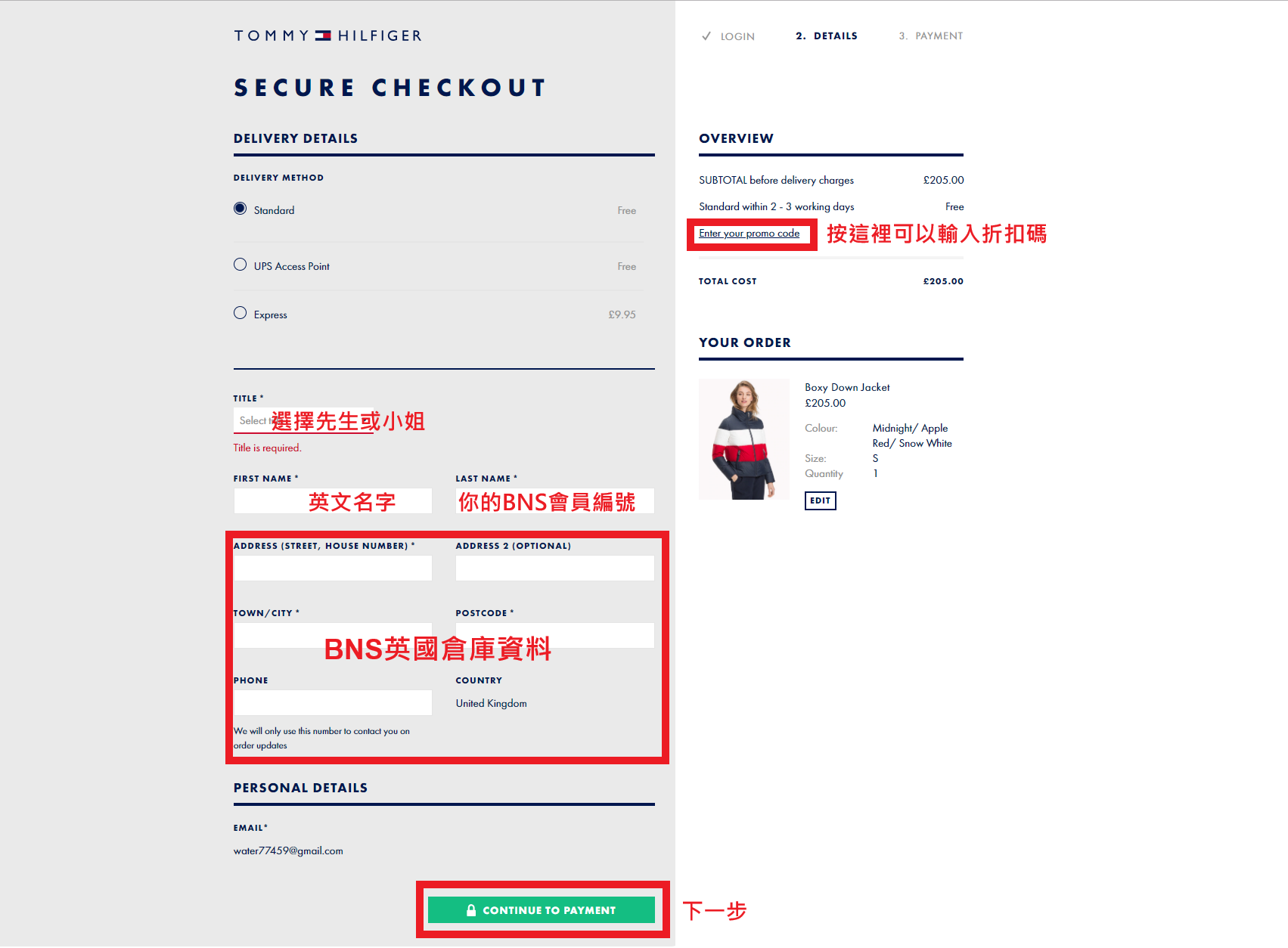 Step5. 接著會進入選擇運送方式、填寫收件地址的頁面,如下圖,記得在「LAST NAME」欄位要填寫BNS會員編號喔!填寫完成後請按綠色區塊接續下個步驟