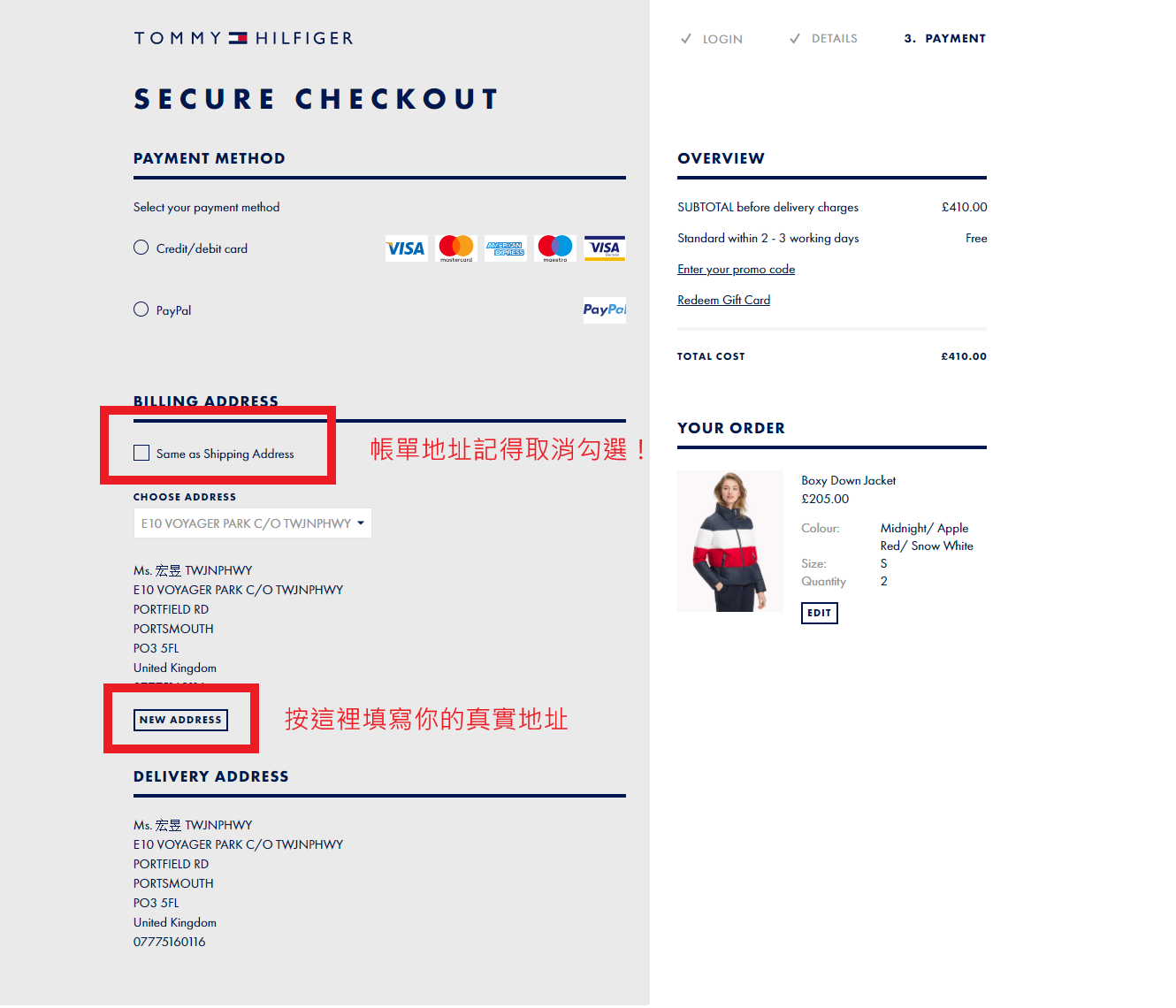 Step6. 選擇付款方式,填上你的真實帳單地址(下方有翻譯連結),就大功告成囉!