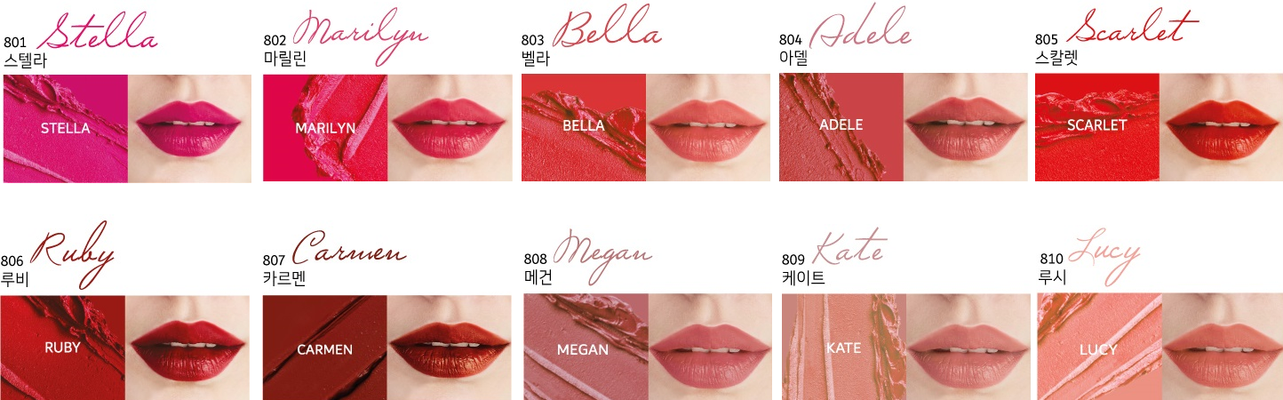 Dear Dahlia最熱賣的唇膏以高質感的大理石包裝搭配玫瑰金邊,以及英文取名的色號,整體打造出的高級感藏也藏不住!色號共有十種,各種氣質的不同顏色都可以找到。DD的唇膏屬於霧面妝感,但韓國的出身讓他的保濕程度一點都不輸人,因此有著滑順不顯唇紋的特點,屬於質地較軟的唇膏,因此延展性也非常出色,顯色的柔霧光澤真是讓人愛不釋手!