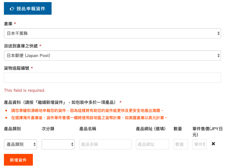 按下申報貨件的按鈕後,選好這次的倉庫,然後再輸入貨物追蹤編號,