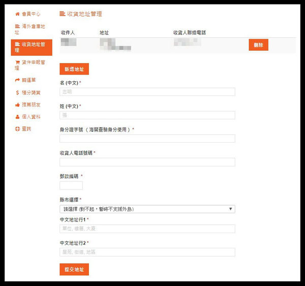 點選【收貨地址管理】→點選【新增地址】→填寫資料(中文)→點選【提交地址】