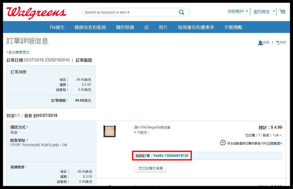 待廠商出貨後,會有一組追蹤訂單編號(以Walgreens為例)