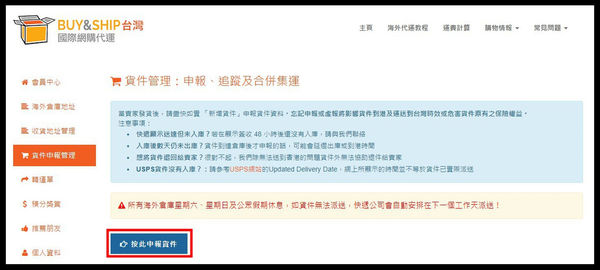 點選【貨件申報管理】→【按此申報貨件】→填寫貨件資料