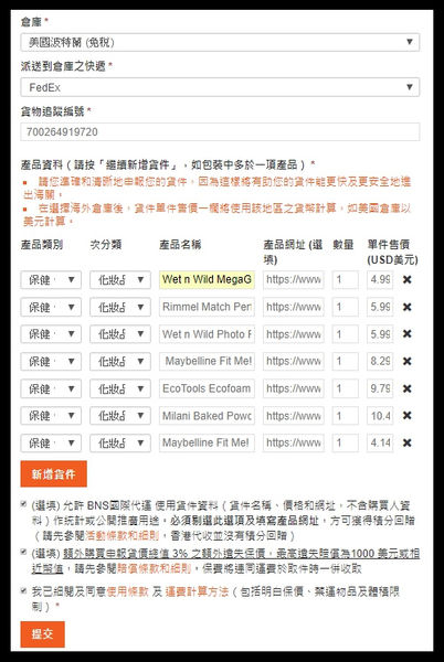 每新增一件物品須按【新增貨件】→完成後【提交】
