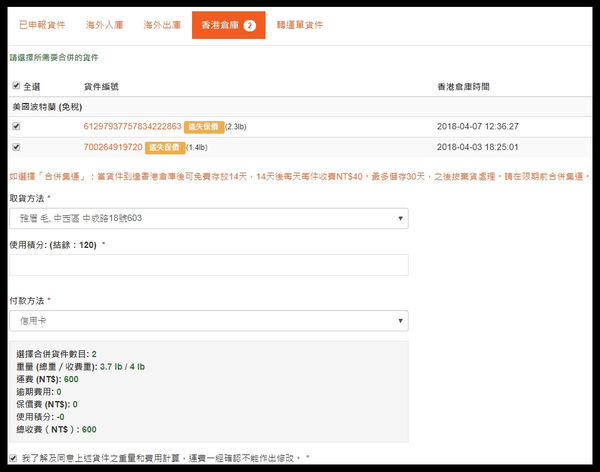商品都送到達香港轉運站後→【勾選要合併的貨件】會跳出重量與集運金額→點選【合併集運選擇的貨件】