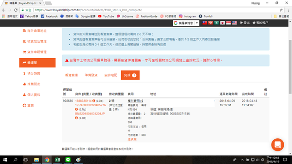 4/9貨件全部到香港,填寫轉運單,4/13收到包裹