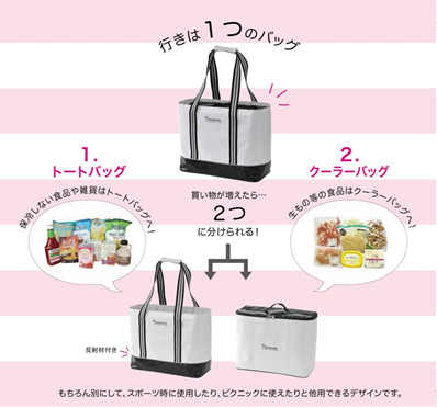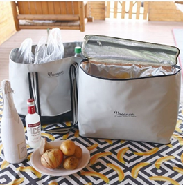 日本知名戶外品牌VACANCES,一款二用。生鮮食物可放入保溫袋,零食雜物可放入手提袋中,或是兩者合併使用。使用戶外帳篷的篷布材質縫製而成,堅固耐用更耐髒,就算食材再多再重也不用怕!