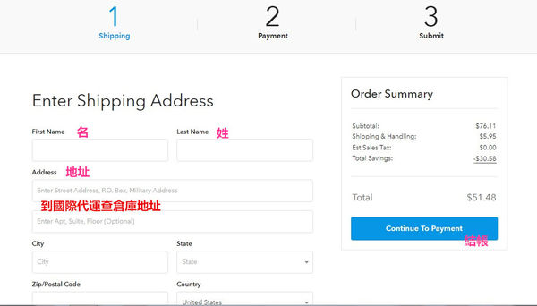 購物車商品決定後按下右下藍色確定鍵,頁面就會出現三步驟,好!我就是在這步驟搞了很久,因為我一直誤會要填香港倉庫,腦海中一直想著從香港倉庫寄來台灣這句話,再加上我對數字敏感度很差,總額超貴都不知道,那時就鬼打牆,一直重複這步驟,重點是香港倉庫的地址根本填不進格子,我還硬要一直試== 最後我才發現運費比商品價格貴,廢話嗎?寄到香港還不貴!那時有點晚也想睡覺了,加上被自己打敗,在電腦前不自覺大笑XD