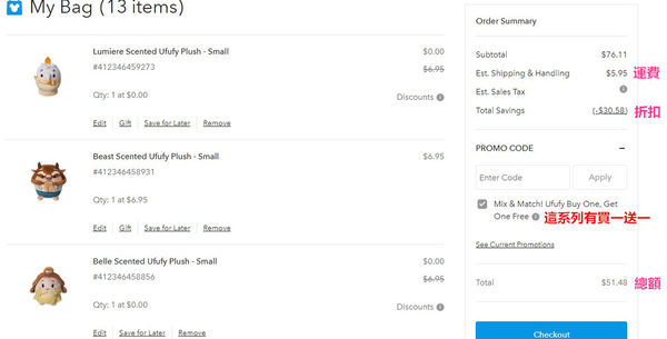 全部逛完之後,點開購物車看詳細的資料,網頁右手邊會看到商品總價格、運費、折扣與最後的總額。這次我主要是要買Ufufy系列的娃娃,好險我晚一天訂,就遇到折扣買一送一,一看到超開心的,超級划算!所以國外網站購物,還是要注意一下它們的折扣時間,才不會錯過驚喜折扣!