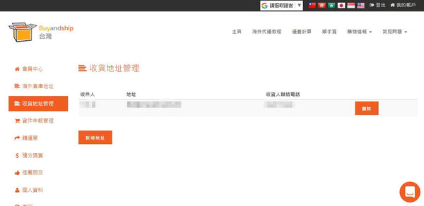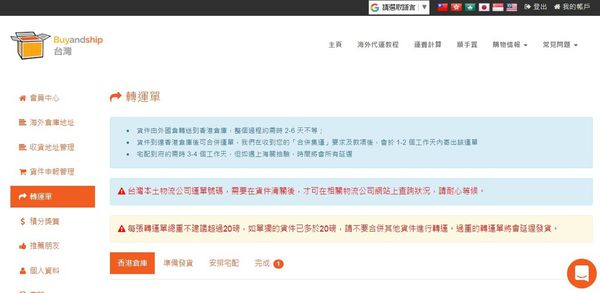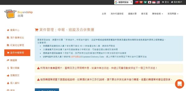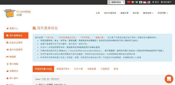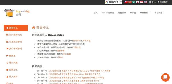 登入後,頁面會到會員中心,可以看一下使用條款、常見問題、代運流程、運費計算等等。