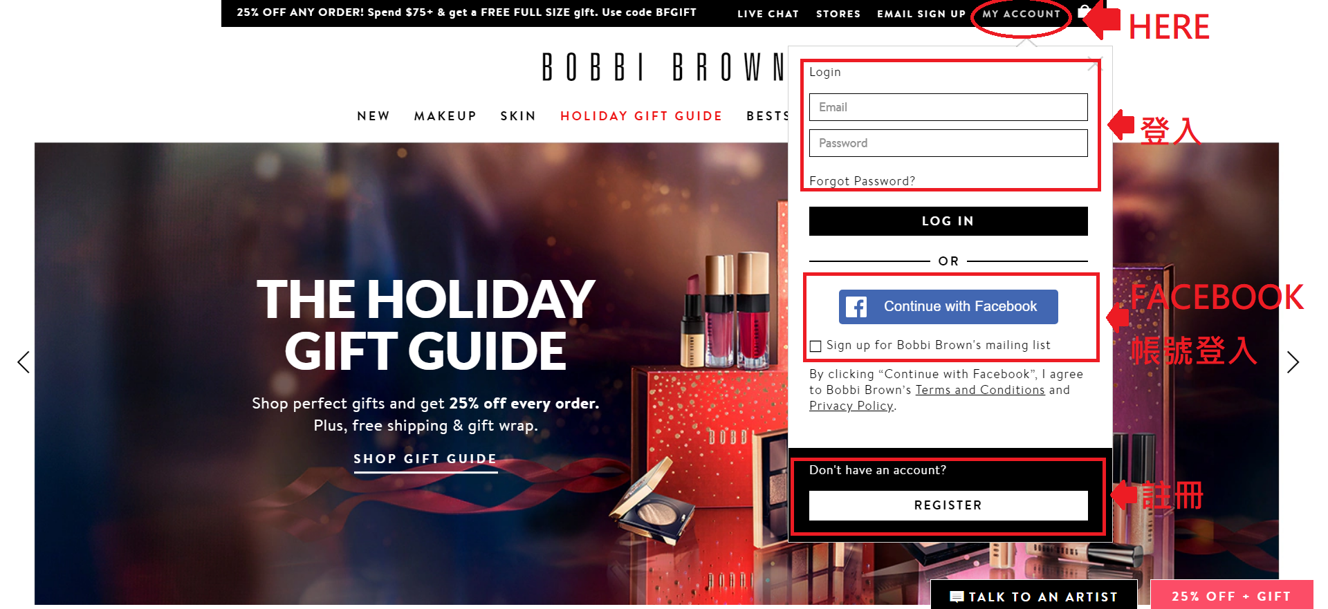 STEP 2.進入BOBBI BROWN官網,接著到游標指向右上方點選「My ACCOUNT」(如下圖),會出現登入、以FB帳號登入及註冊三個欄位,選擇後依序填入資料完成登入。