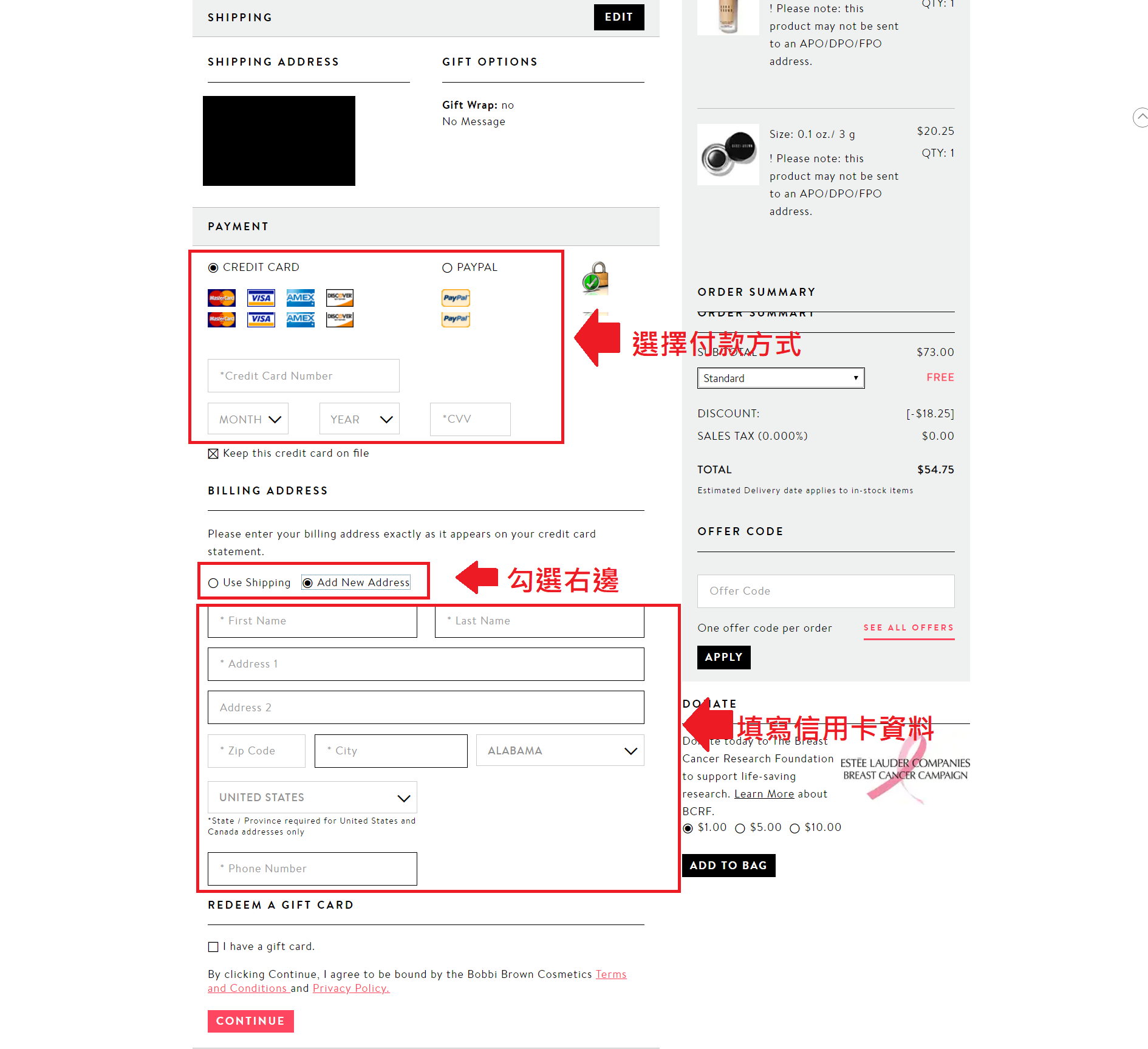STEP 6.接著便會進入付款頁面(如下圖),共有兩種付款方式,勾選後填寫資料按下「CONTINUE」便可付款。