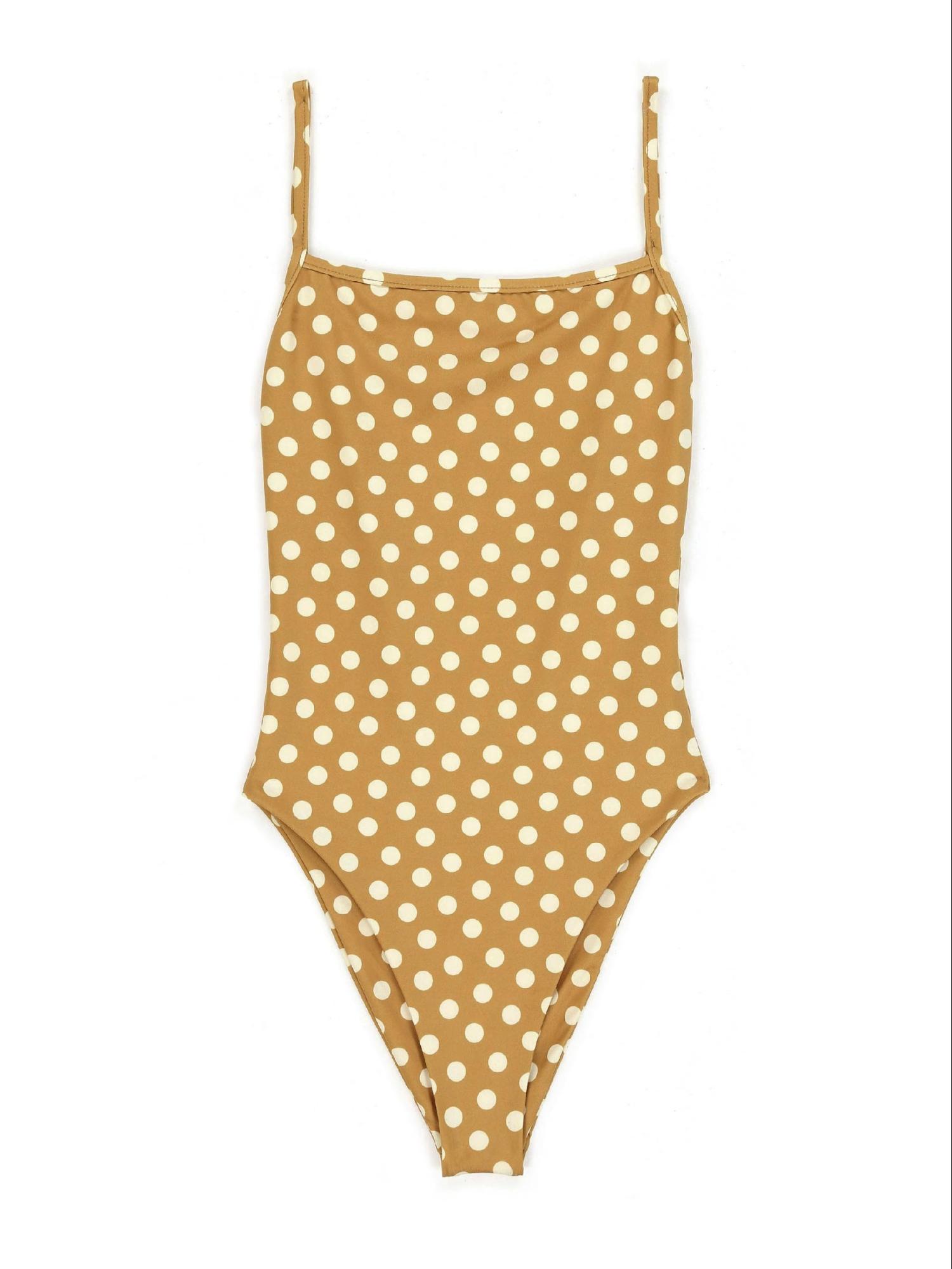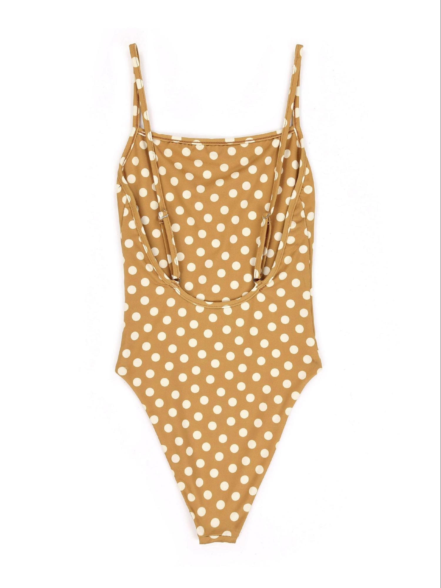 高衩的連身泳衣可以修飾腿型,拉長身體比例,是Shea Marie非常愛用在連身泳衣的設計,這款泳衣配色以溫暖又充滿加州陽光的土黃色系為底,加上白色大圓點陪襯,穿上這款One Piece Swimsuit讓人彷彿回到80年代。