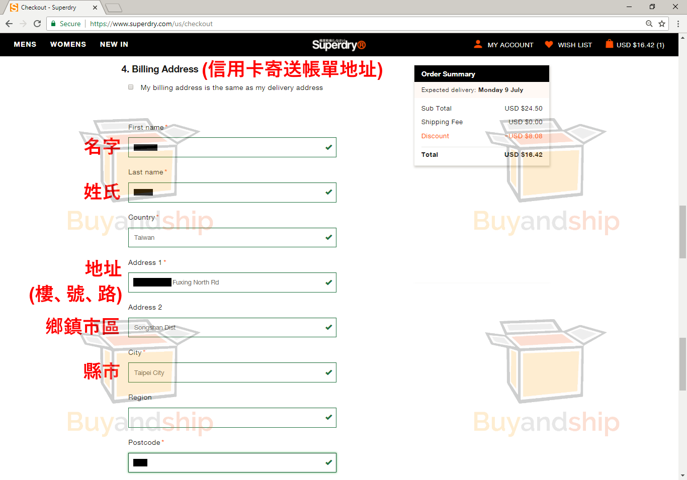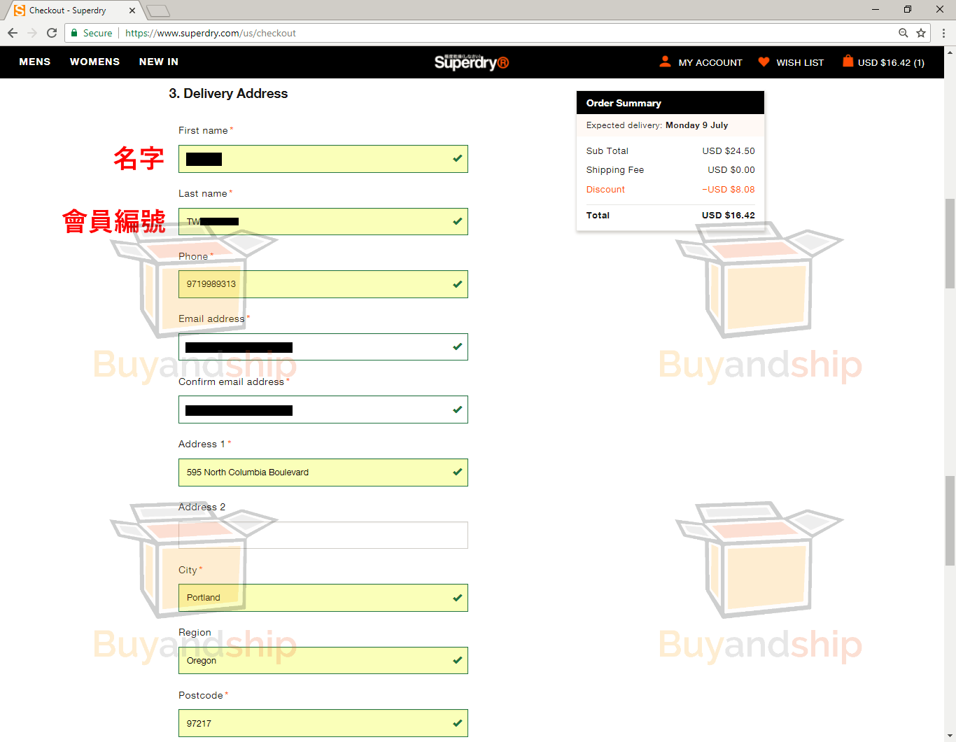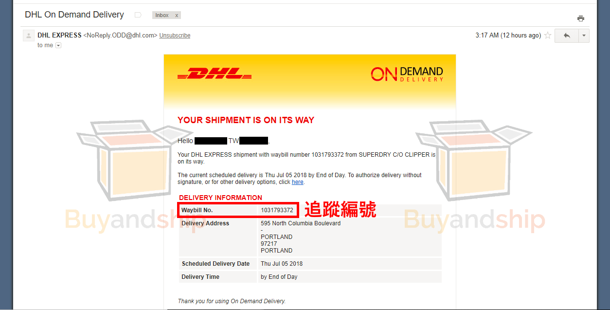 8)訂購完成!之後Superdry會使用DHL寄送到Buyandship美國倉庫(依照前文操作就有境內免運),收到追蹤碼後就可以登入Buyandship申報你的貨件,就可以坐等包裹啦!