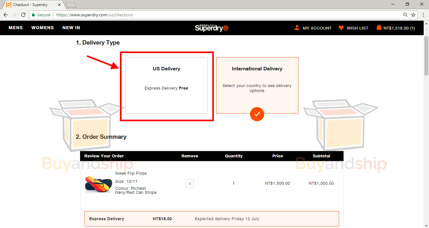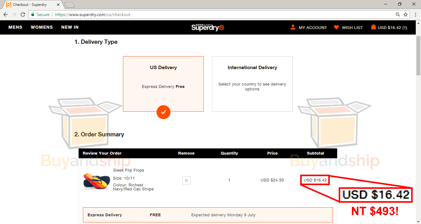US Delivery,美國境內免運費!當選擇「US Delivery」之後,訂購的金額才會顯示為「折扣後」的價格喔!是不是差好大!