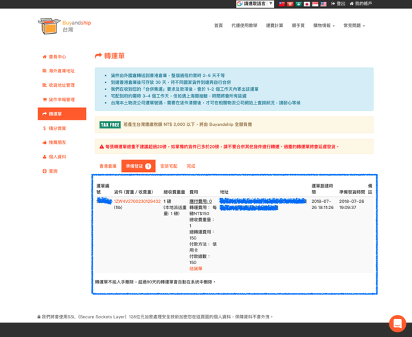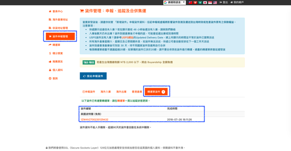 ▲當你到 BuyandShip 的貨件申辦管理可隨時查看貨物目前動向,由上圖可得知,已到台灣並準備發貨。