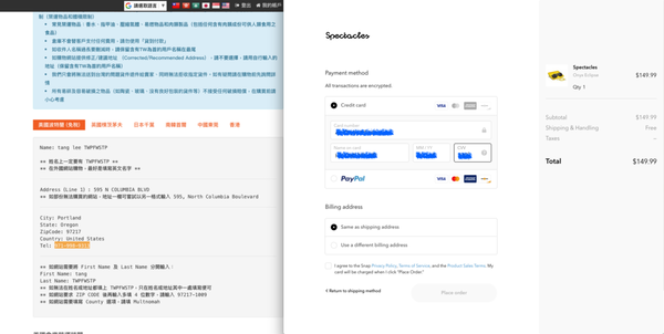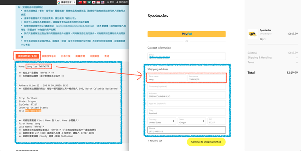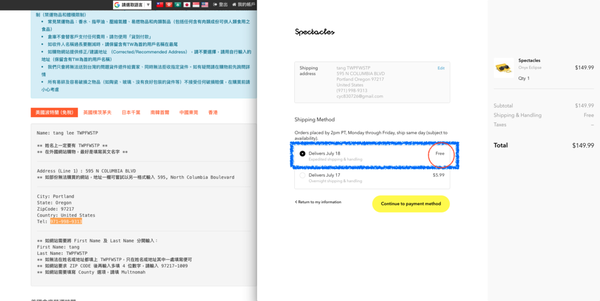 ▲國外官網下訂後需輸入相關地址,這時可打開 BuyandShip 的網頁,有分不同的集貨地,選擇「美國波特蘭(免稅)」這個按鈕,並將地址及名字填入 Spectacles 智慧眼鏡購物頁面。