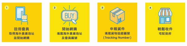 ▲ BNS四步驟:註冊會員→開始網購→申報貨件→宅配到府取貨超便利。