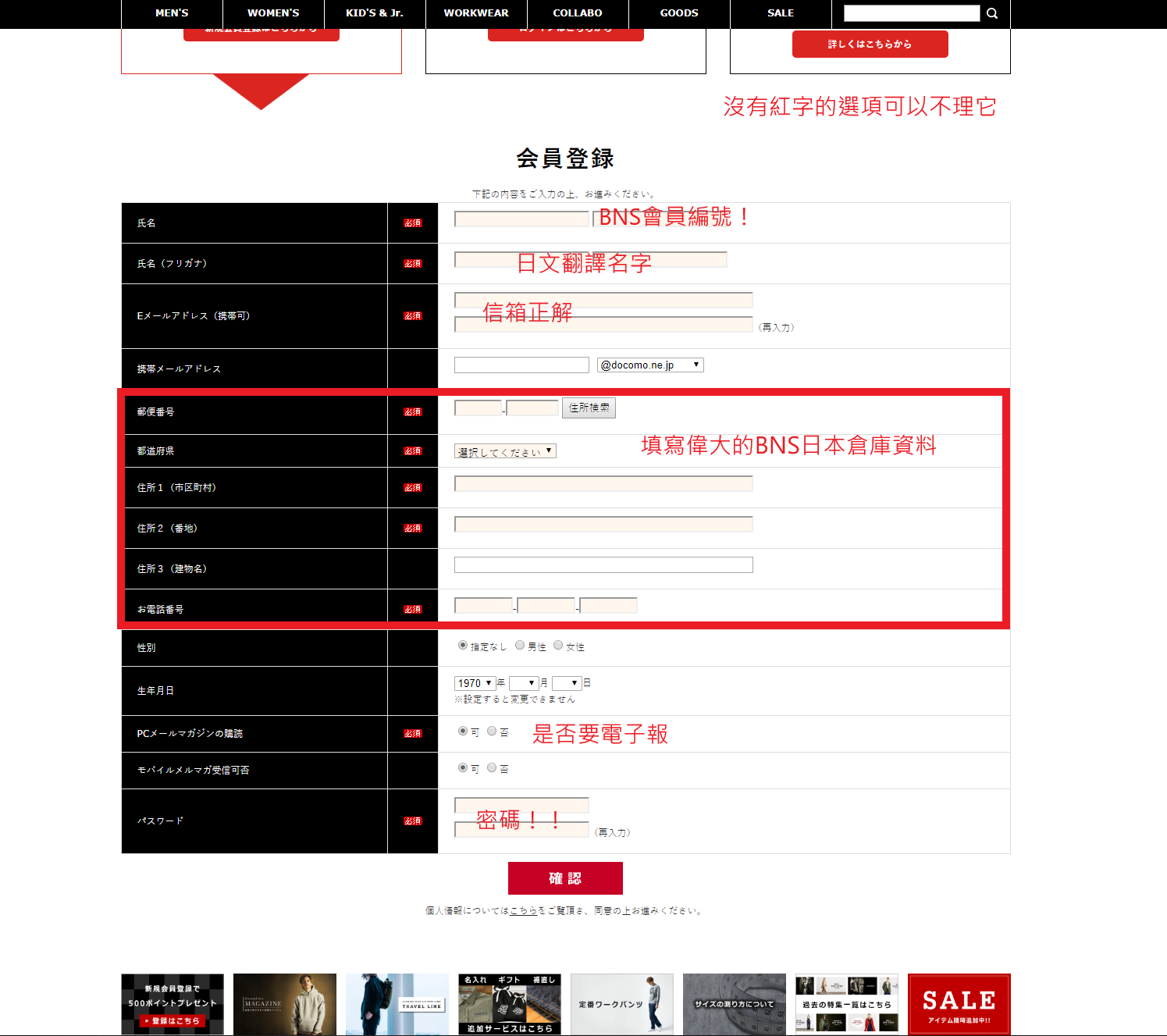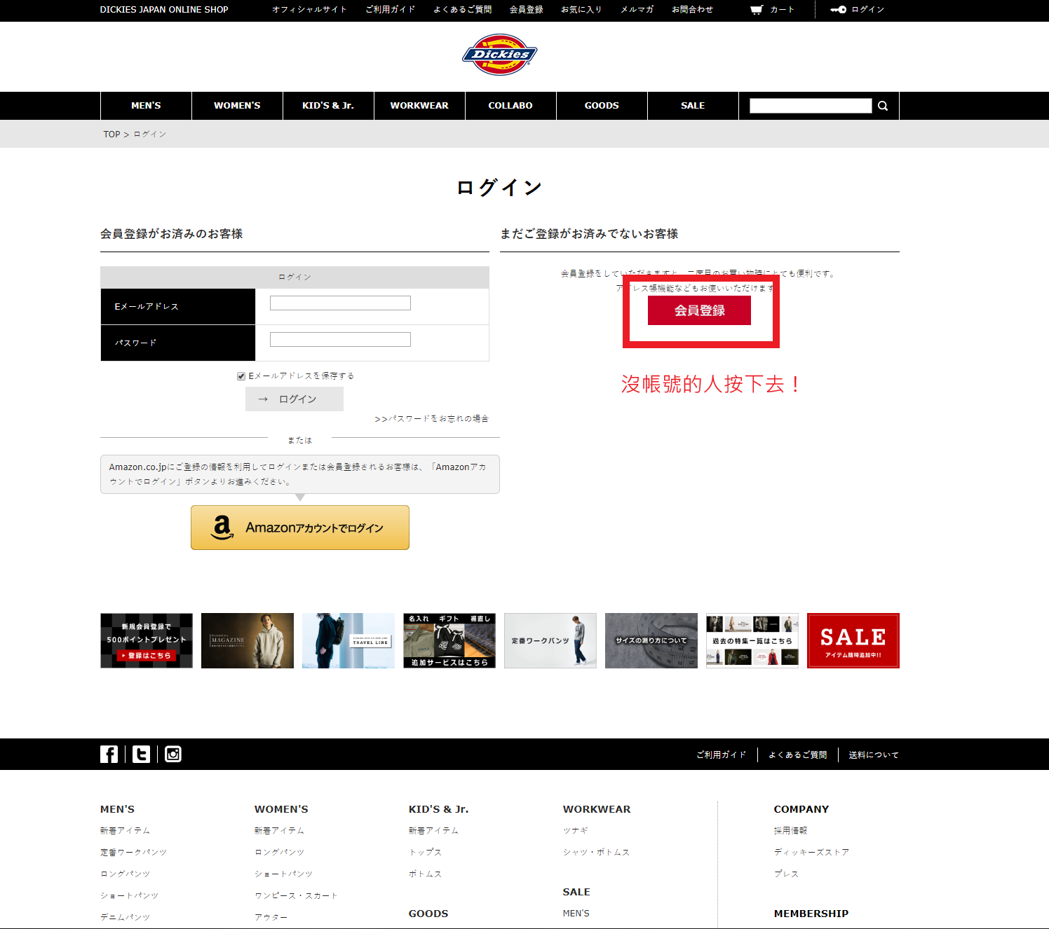 Step2. 到Dickies日版官網去盡情購物,還不是會員的人記得先註冊,這裡註冊需要你的BNS會員編號及倉庫資料哦!