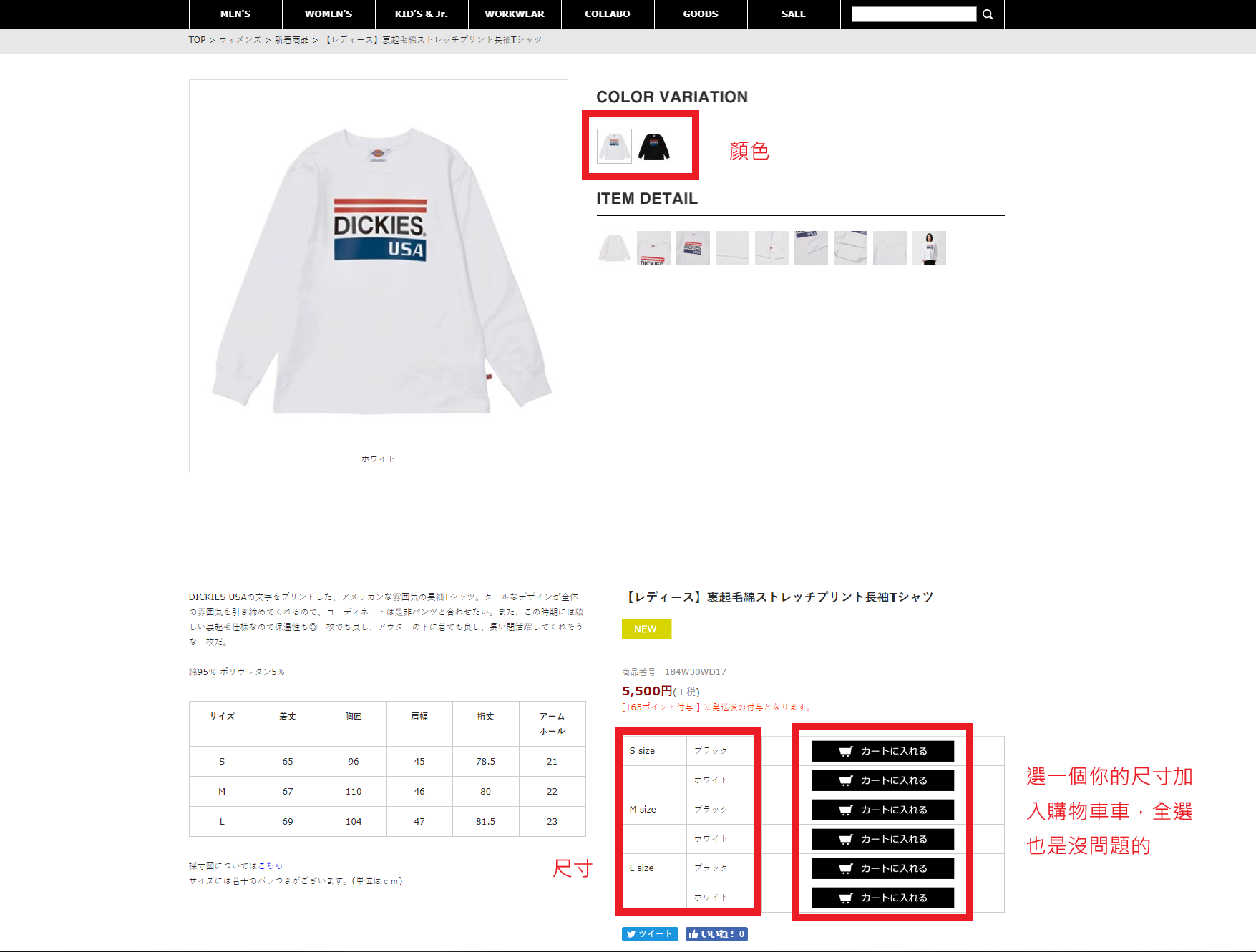 Step3. 如下圖,挑選喜愛的商品,選好顏色及尺寸後,加入購物車