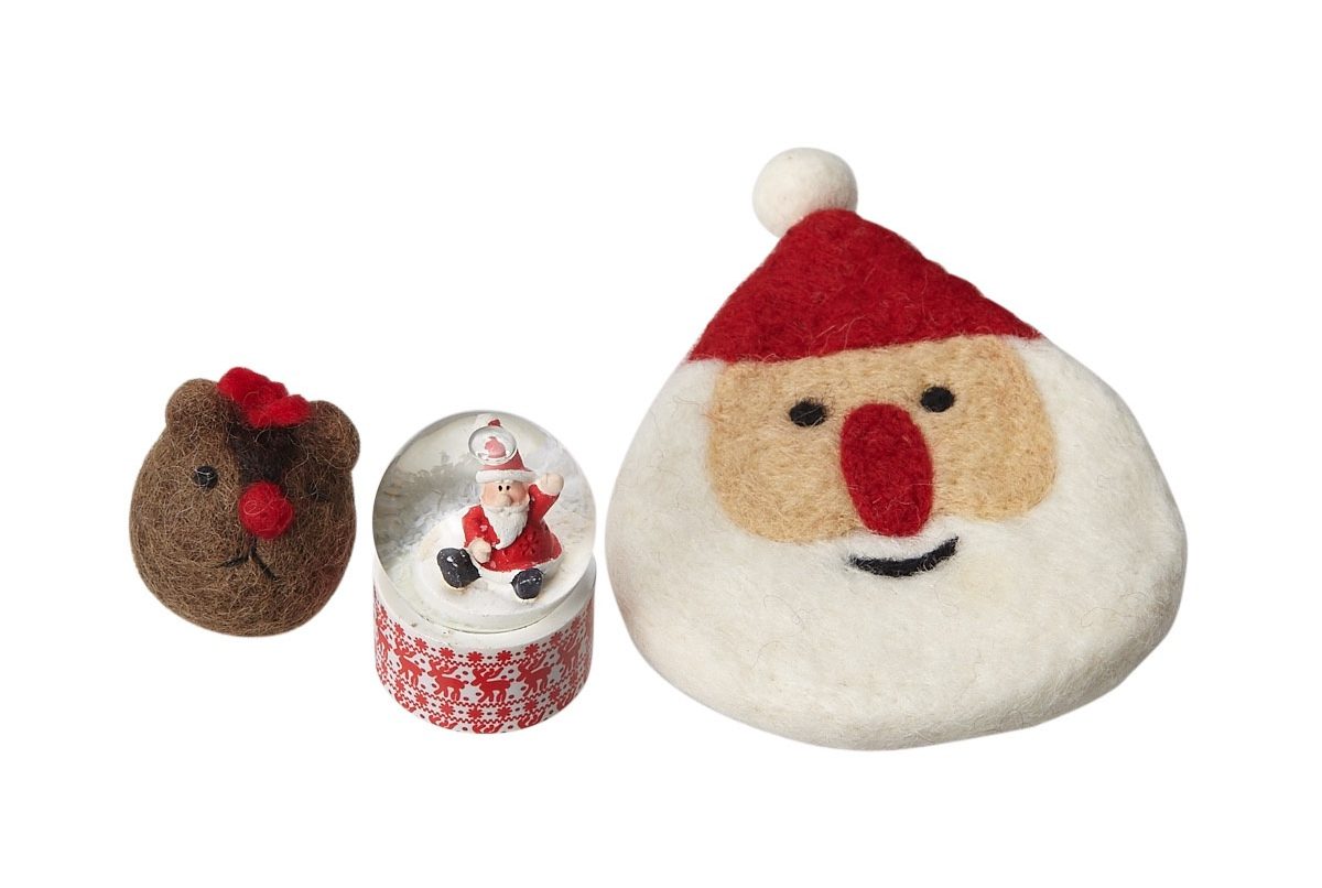 聖誕老人羊毛氈、馴鹿羊毛氈磁鐵和雪花球套裝,用喜馬拉雅和西藏附近的羊毛為原料,在尼泊爾手工製成的聖誕老人羊毛氈和馴鹿毛氈磁鐵,每個臉孔和細節都獨一無二,暖暖的羊毛氈在寒冷季節陪伴你,讓空間更增加溫暖質感。