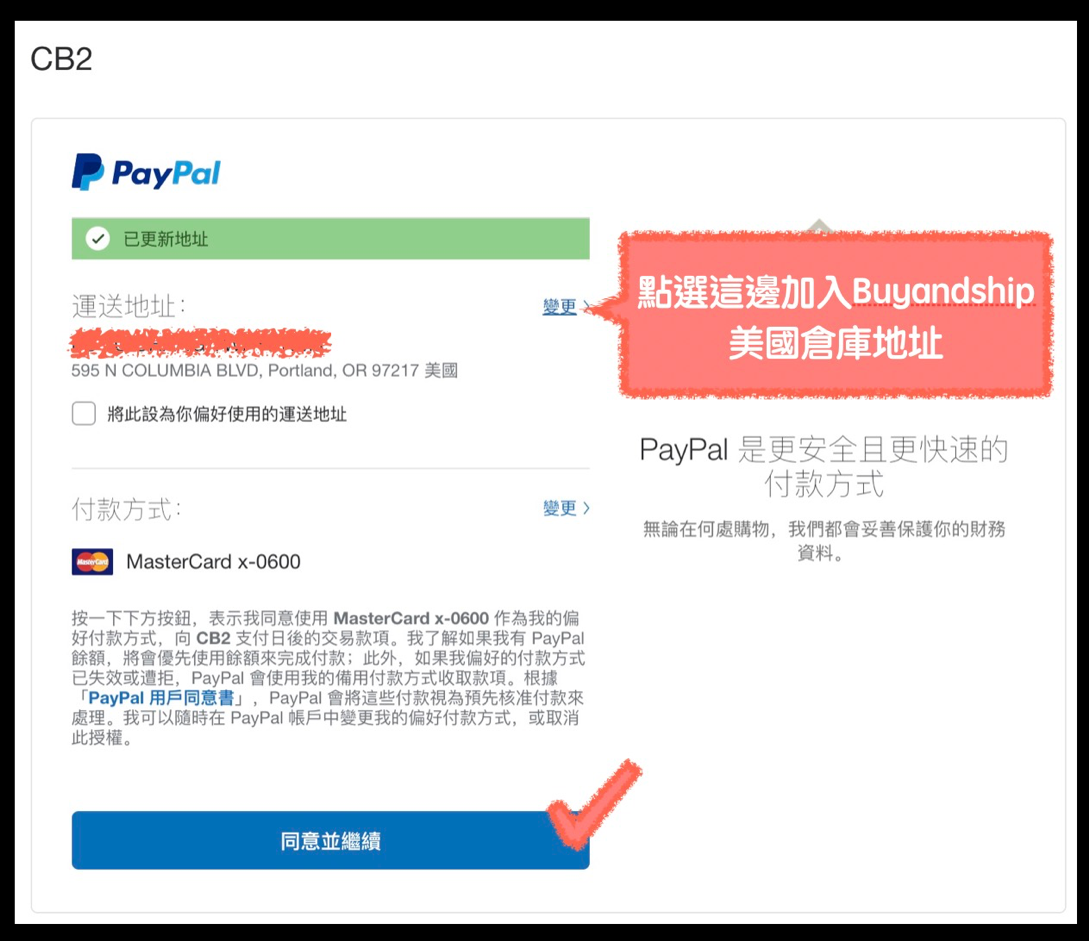 Step 5. 之後會進入Paypal的頁面,可從變更地址選項加入buyandship的美國倉庫地址。勾選同意之後,會回到CB2的網站。