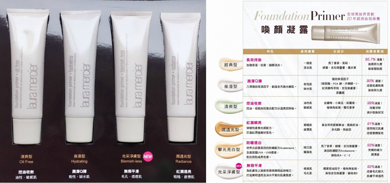 Laura Mercier家的明星商品喚顏凝露有保濕款、一般款、清爽款、亮白款、光彩款、潤透款共六種,能依照不同膚質挑選適合自己的商品。好的Primer能為肌膚打造好基底,形成與肌膚做完美隔離並同時保養肌膚的薄膜,在妝前給予肌膚足夠的水分平撫紋理也能讓後續上妝更為輕鬆簡單,整肌步驟能讓肌膚成為完美畫布,進而打造好妝效。這款幾乎零負評的凝露你一定要試試看 !