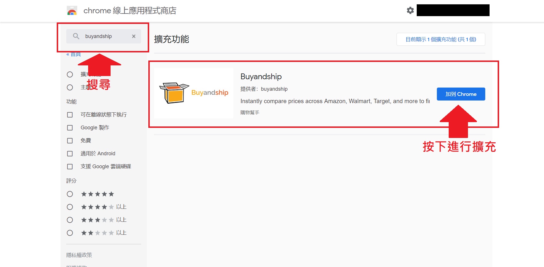 只要 點入 “擴充連結” 或是直接到Chrome應用商店(如下圖),搜尋Buyandship找到程式後按下 “加到Chrome” 完成擴充功能的安裝,往後的購入都能靠Buyandship輕鬆比價、便宜購入~