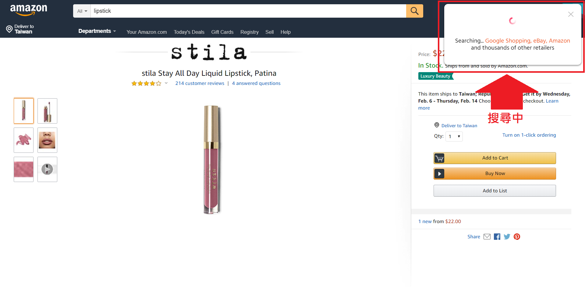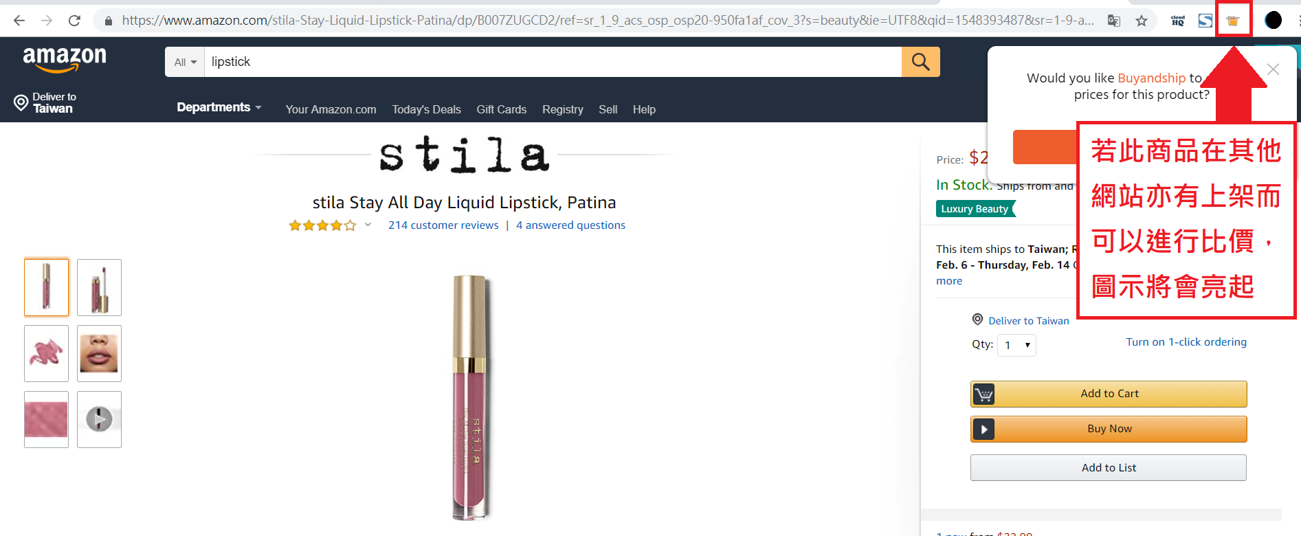 在安裝完畢後像平時一樣在網頁中尋找你要的商品,若此商品在其餘網站亦有而可進行比價時,Buyandship 圖示就會亮起(如下圖)。