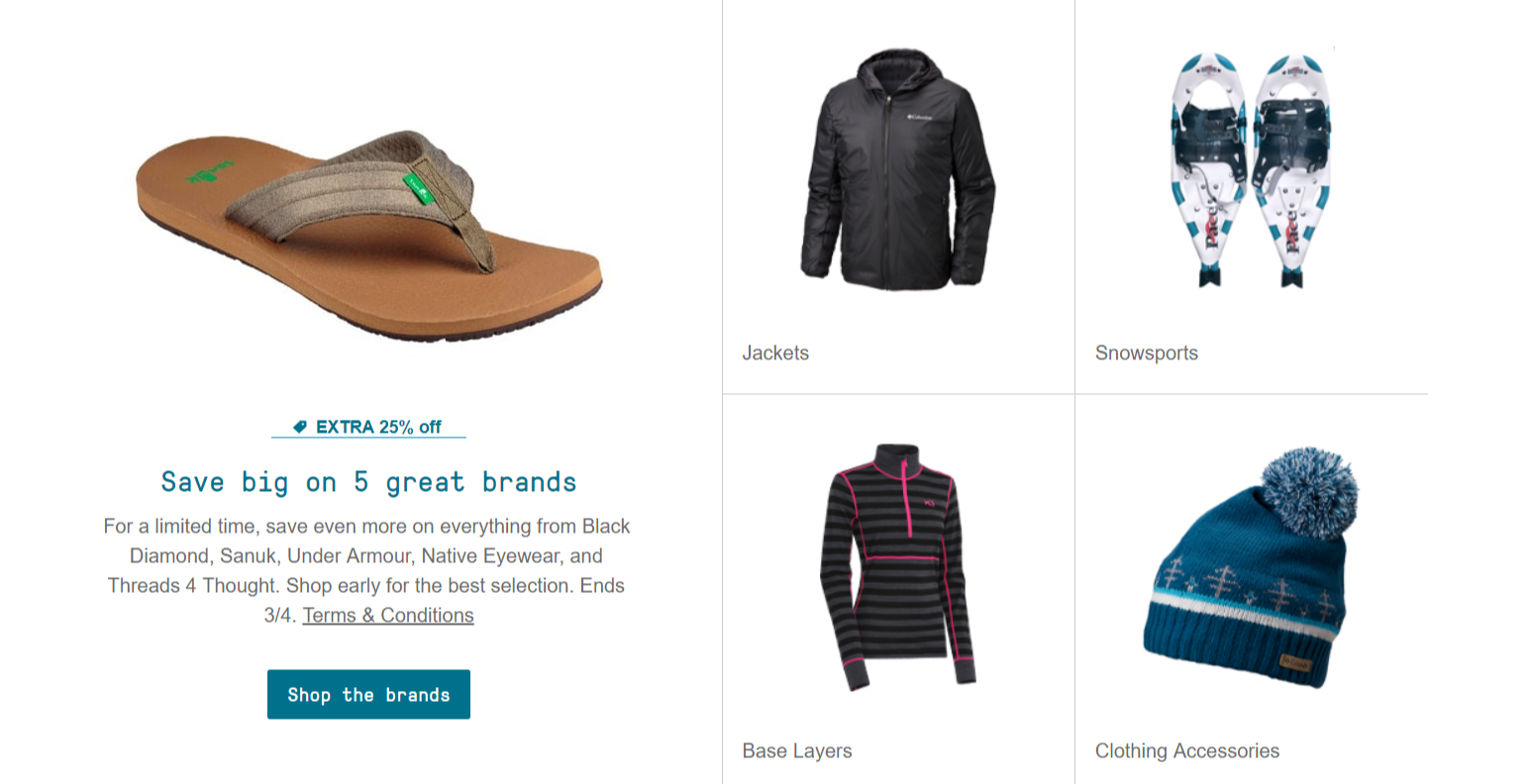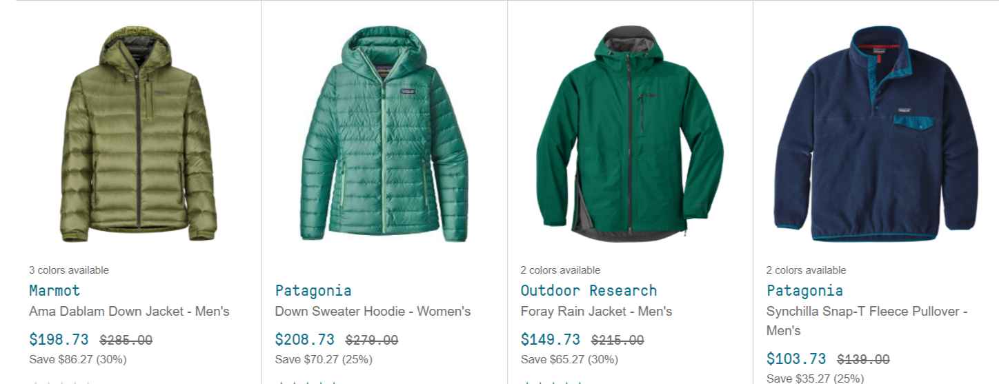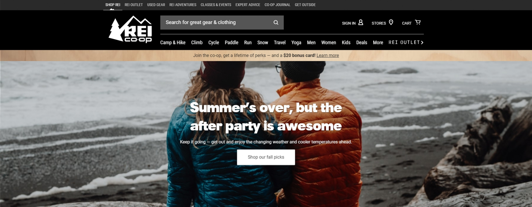 REI(Recreational Equipment, Inc.)1938年創建,是全球最大的戶外用品連鎖零售組織,品牌歷史悠久,網站上同時販售超過四萬種商品,從登山、露營、健身、旅行、自行車裝備及水上、滑雪裝備等等都有,眾多知名品牌像是Patagonia、Columbia、Mountain Hardwear、Marmot等都有,此外也有自有品牌REI,以高品質著稱,並且會不定時推出優惠折扣!