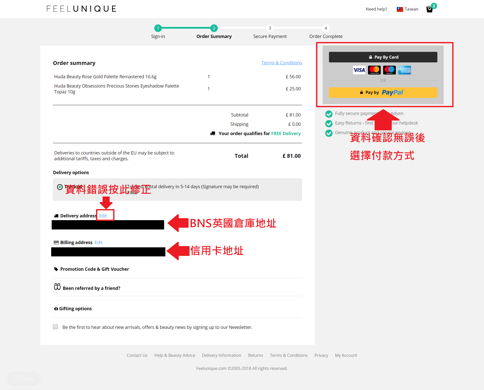 STEP 6.確認結帳資料(如下圖),注意運送地址及帳單地址是否無誤,確認無誤後至右上方選擇付款方式。