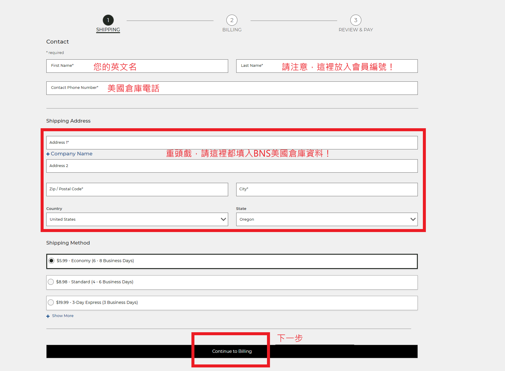Step5. 進入收件資訊頁面,填上BNS的美國倉庫資料!