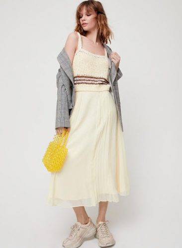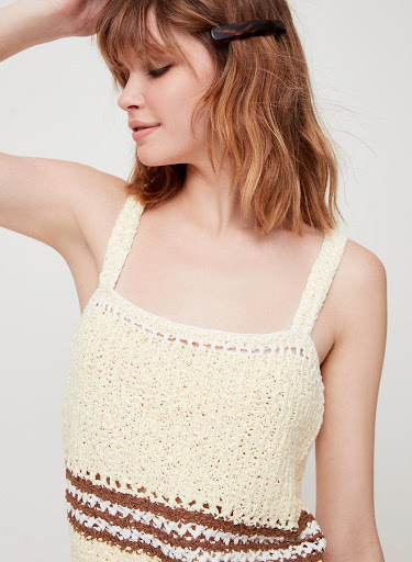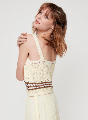奶油黃的短版針織背心,完全為夏季做準備!小編自己很喜歡這種平口粗肩帶背心,覺得還蠻能修飾副乳的,雖然說有些人覺得這種平口背心很顯副乳不敢穿,但是其實那些貼身的背心反而讓副乳更明顯,因此如果有副乳困擾的人,可以考慮購入這種寬鬆版的背心試看看!