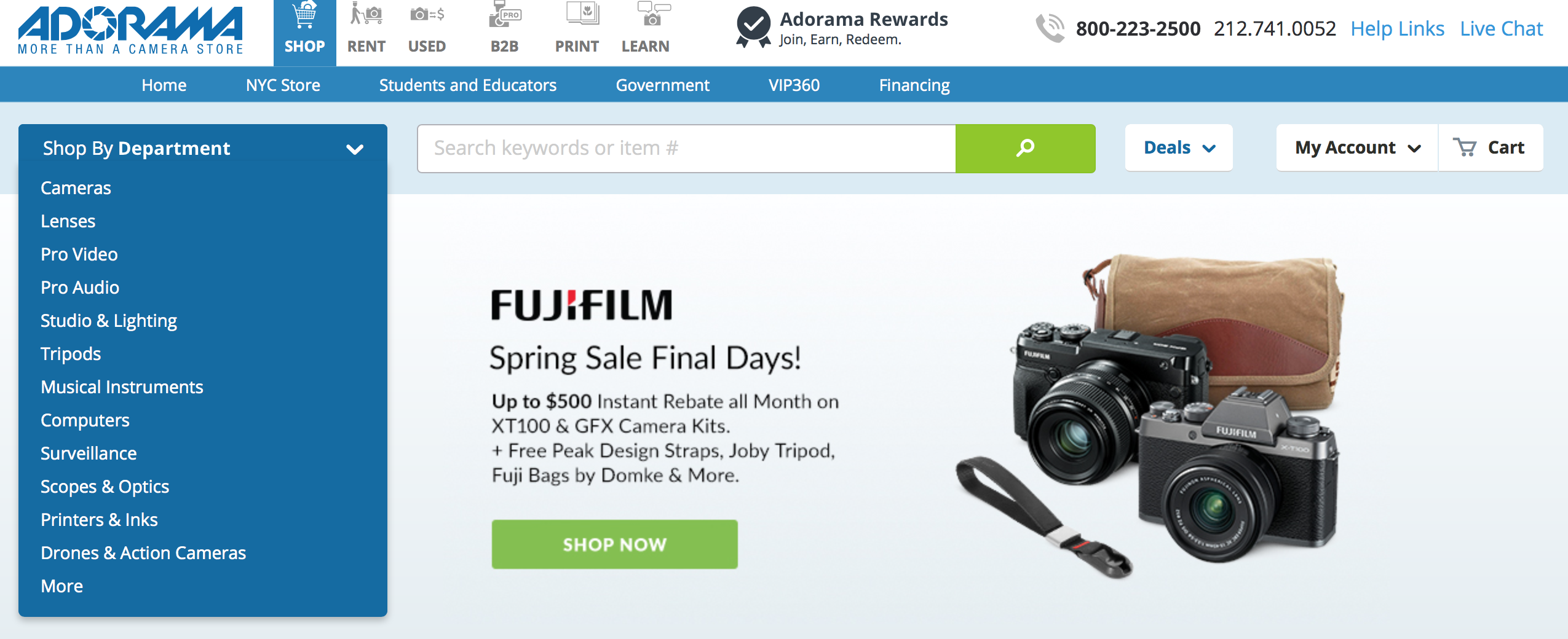 B&H身為2018全美票選最佳數位電商,在紐約也有實體店面。 B&H和Adorma是美國兩大攝影器材經銷商, 大量進貨使消費者都能在這購入最實惠的攝影器材,B&H免州消費稅的服務也使它成為美國人心中的3C用品電商首選,註冊會員購買商品還可享有折扣喔!