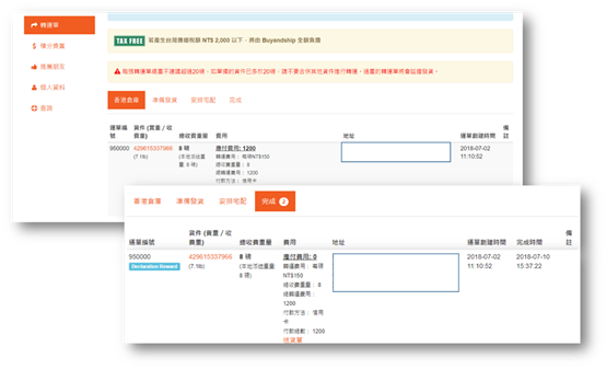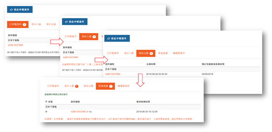 申報後的商品從到達日本倉庫、安排上機到香港,再進入香港倉庫,一切流程都可在會員中心的「貨件申報管理」中看到,也會收到email通知。貨件抵達香港倉庫後,就可這批貨件建立轉運單。
