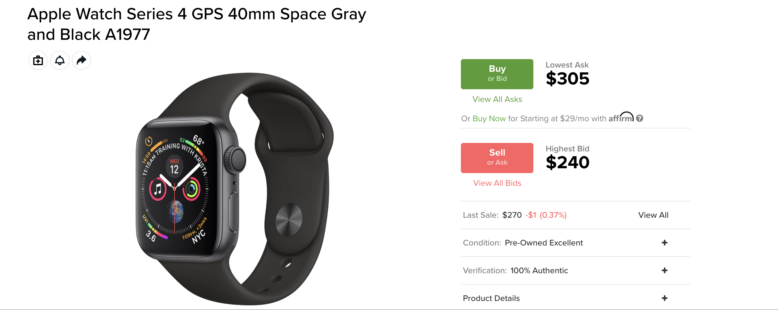 蘋果迷們必備的Apple Watch,Series 4系列具備GPS,台灣網路價12,900元,在Stock X網站入手,竟然只要美金305元(約台幣9,500元)!!可以用不到一萬塊錢帶走一隻Apple Watch,而且品質保證,不怕買到仿冒品,這麼超值,還不快到Stock X 上搶購!