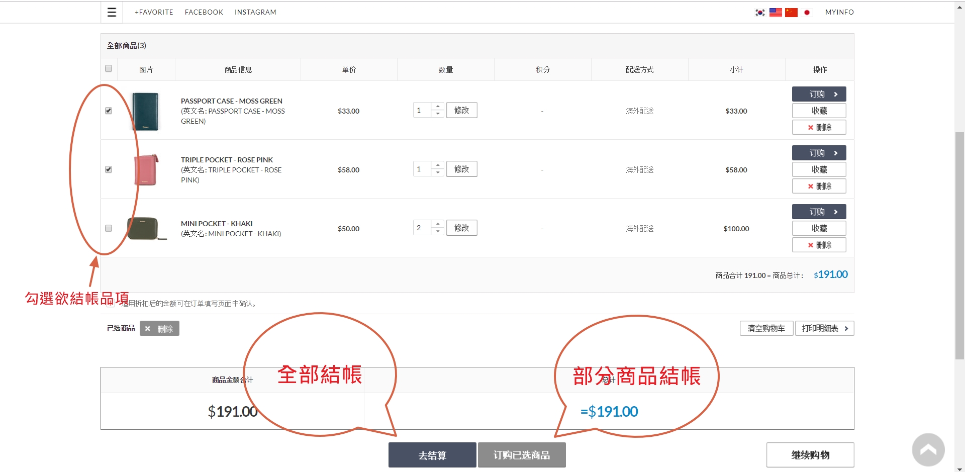 商品左側可選取要結帳的品項,再按下右下方部分結帳,或直接按全部結帳。