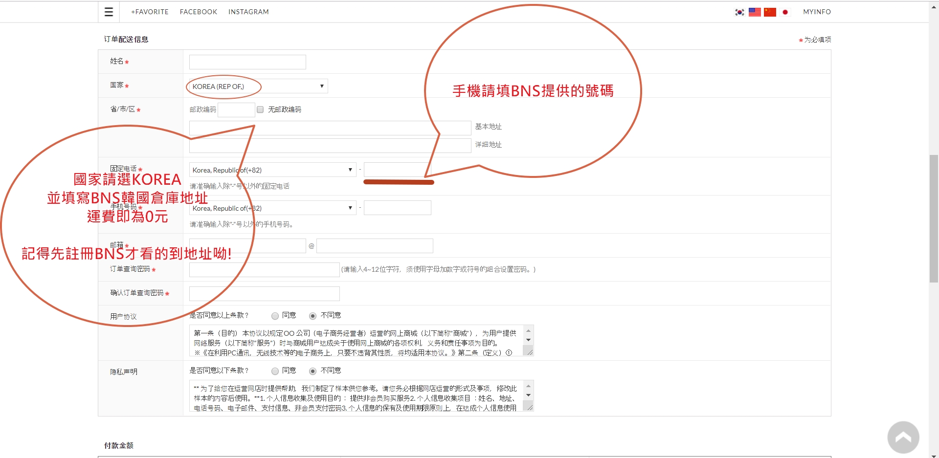 Step5. 重點來了,請登入Buyandship會員中心,複製韓國倉庫地址作為妳的收件地址,這樣一來妳的運費就是0元~而手機號碼也要填寫Buyandship所提供的號碼,記得把數字中間的槓槓去掉,填寫完畢後請點選最右下角的「提交訂單」