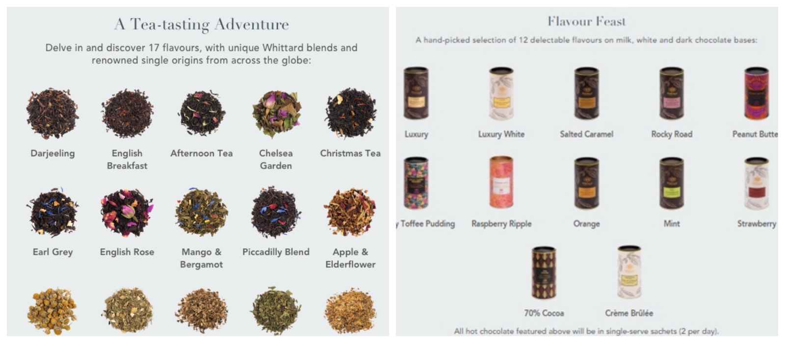 今年一共有二款,茶葉聖誕倒數月曆內共有94個獨立茶包,一共有15種不同口味;以及今年新推出的熱巧克力倒數月曆,共有十二種口味讓你今年冬天超暖心! 太優雅的包裝,開箱完畢還能搖身一變作為收納盒或首飾盒,重複利用最環保,而且英國境內免運費喔!