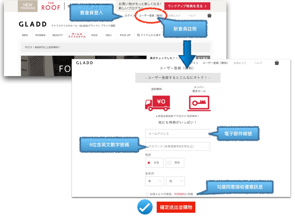 開始購物前的第一步就是申請GLADD帳號,依照圖示操作並點選最下方的“確定送出並購物”,就完成囉!