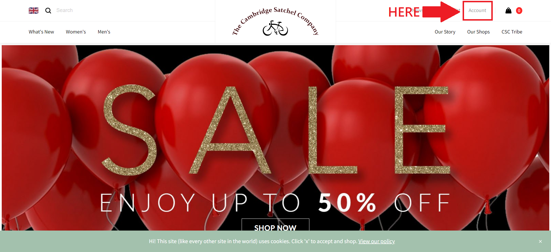 STEP 2.進入The Cambridge Satchel Company官網,接著到右上方點選「Account」(如下圖)